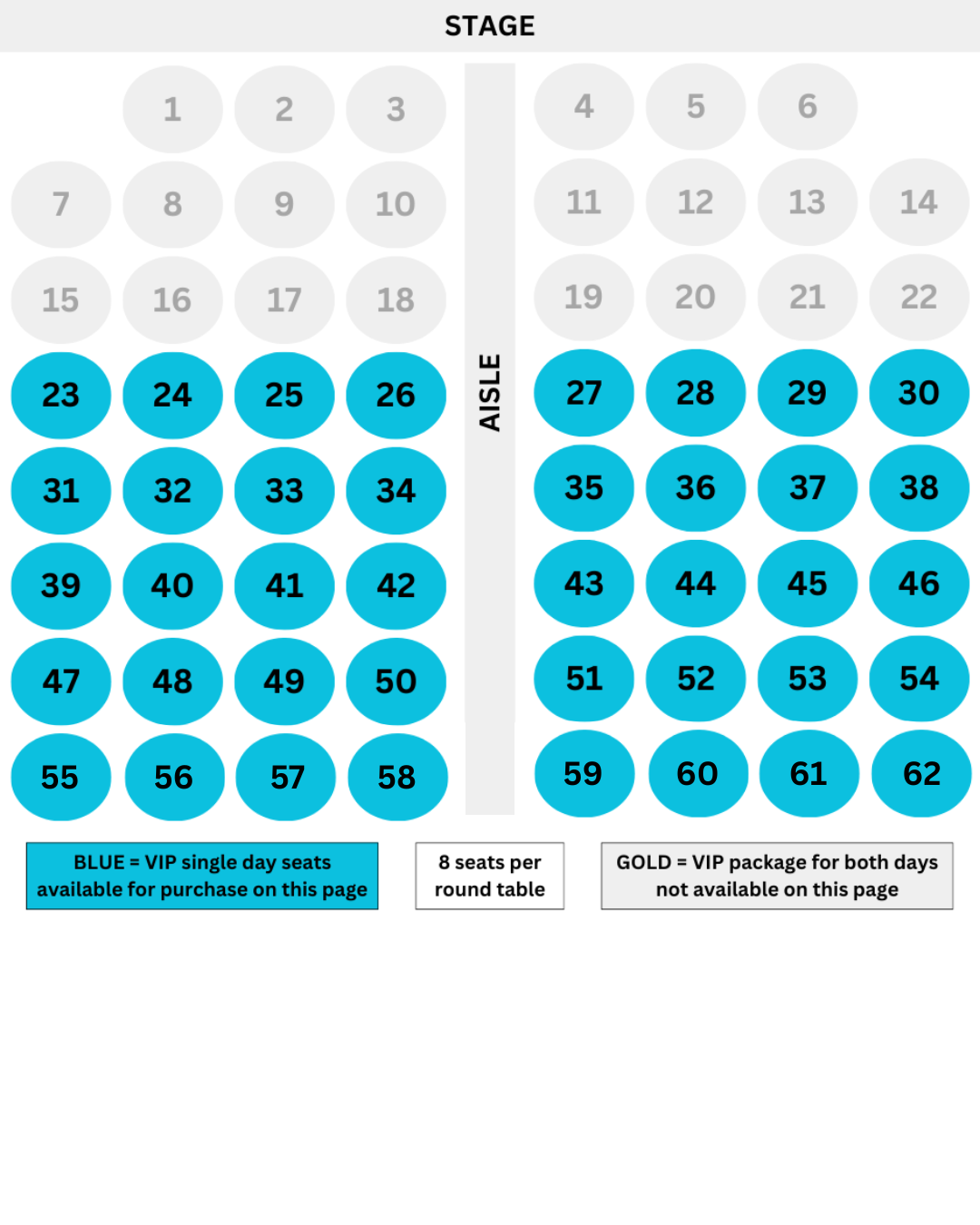 8 seats per round table.
